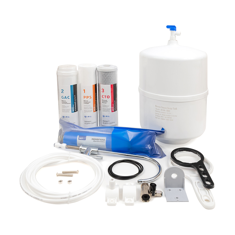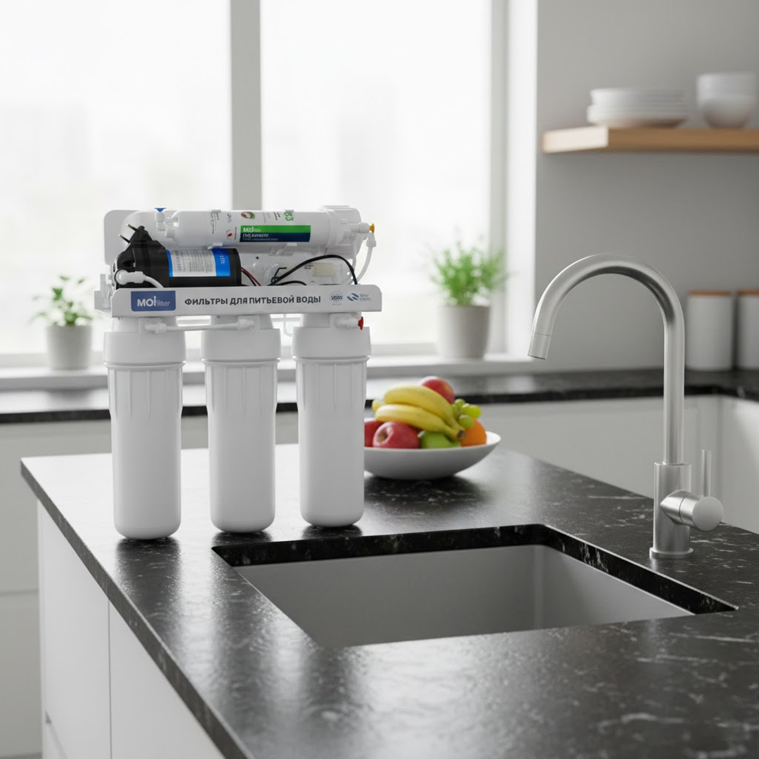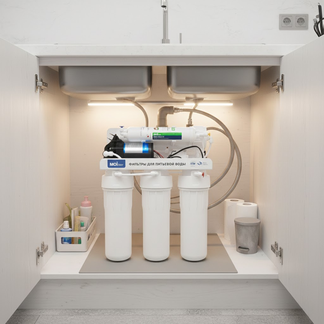 Moi Filter MF-001 Eco — компактная и надёжная система обратного осмоса для глубокой очистки питьевой воды в домашних условиях.