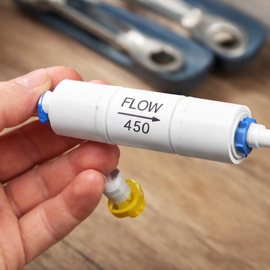 Moi Filter 450CC — ограничитель потока воды (дренажный клапан) для систем обратного осмоса. Регулирует скорость потока воды при промывке мембраны и обеспечивает корректную работу системы.
