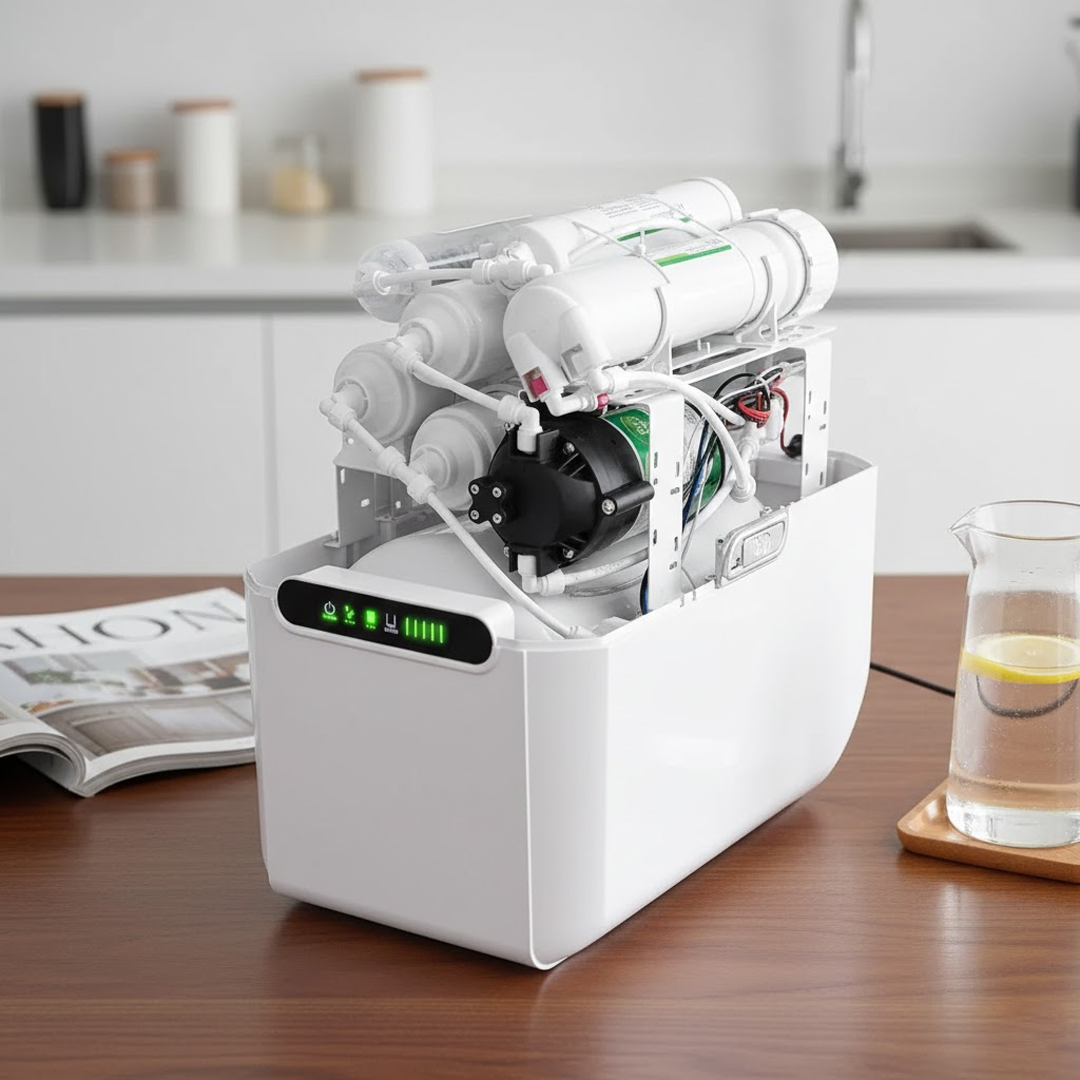 Домашняя система обратного осмоса с 6 ступенями очистки, эффективно удаляющая до 99% загрязнений, включая хлор, ржавчину, песок, неприятные запахи и посторонние вкусы. Обеспечивает чистую и безопасную воду для питья и приготовления пищи.