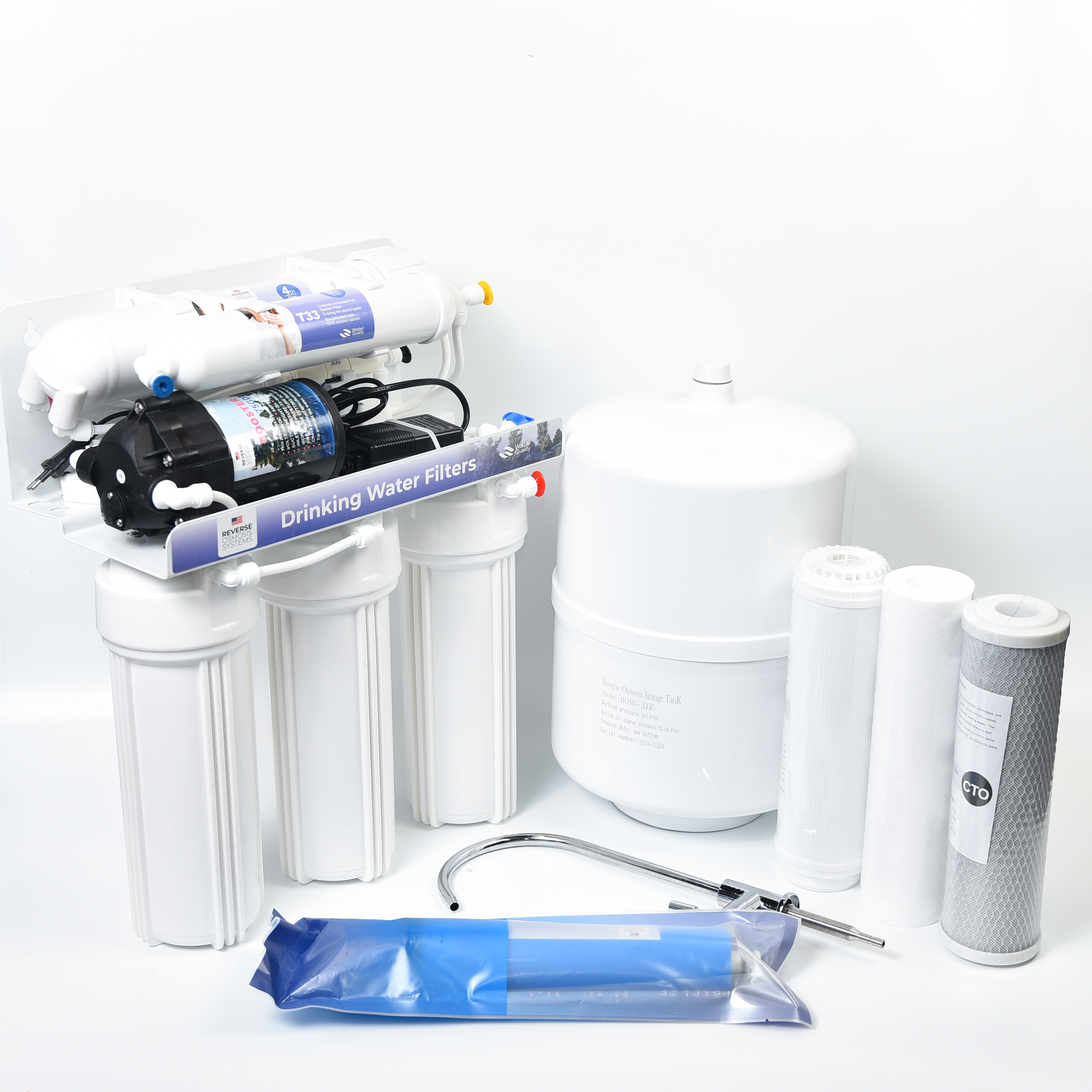 • Накопительный бак 8 л. • Хромированный смеситель • Блок питания • Фильтрующий модуль (картриджи) • Руководство по эксплуатации • Все необходимые фитинги и запчасти для установки