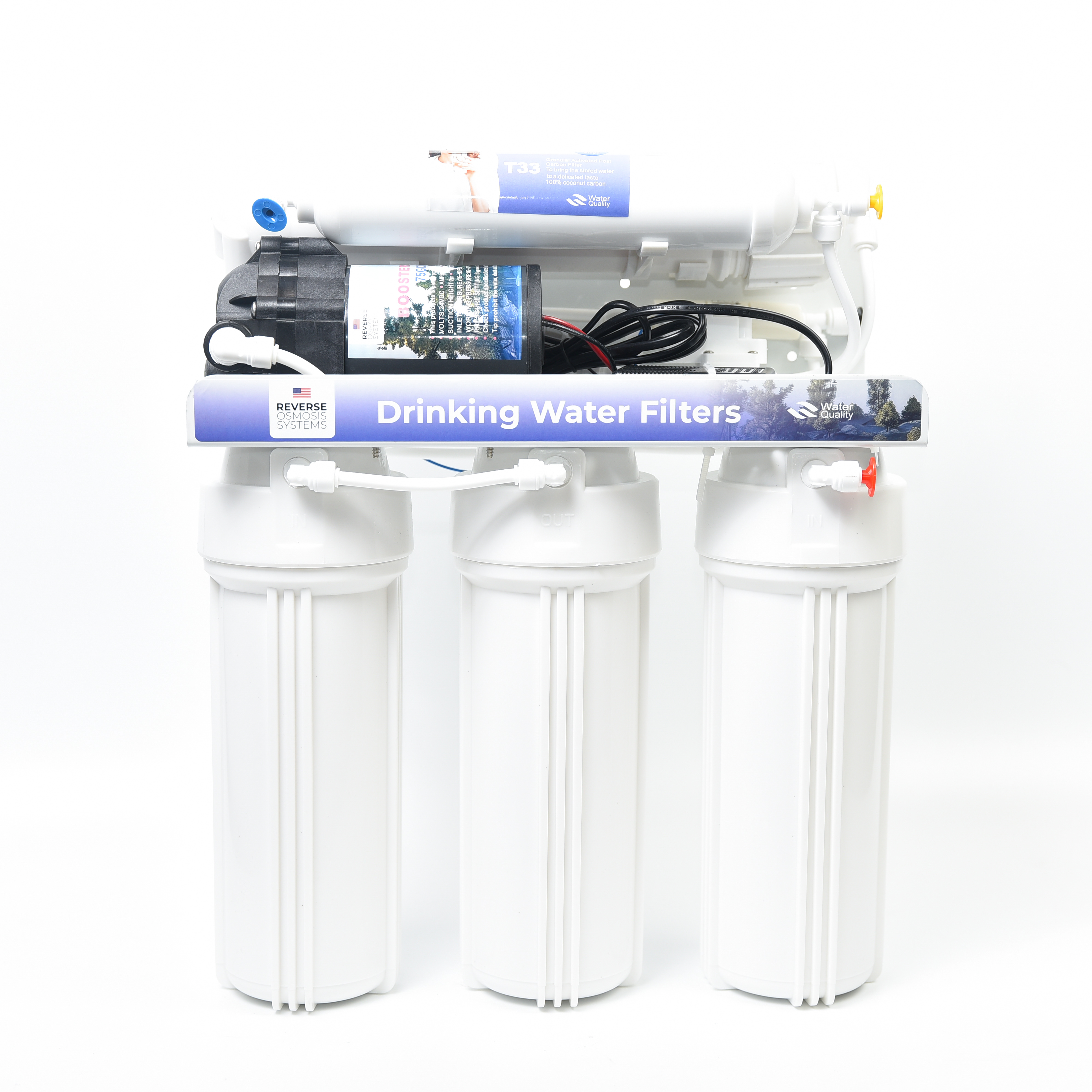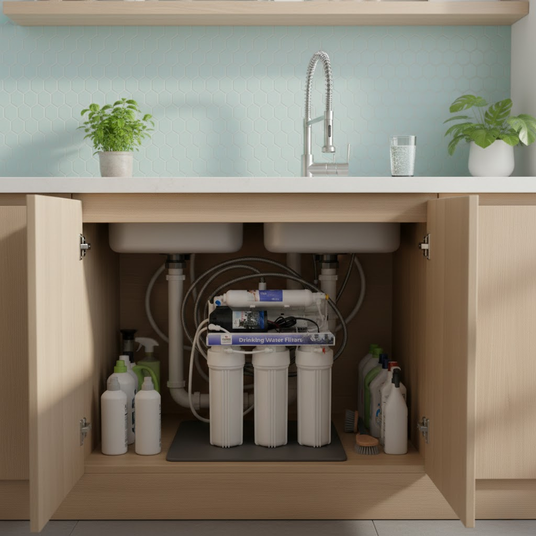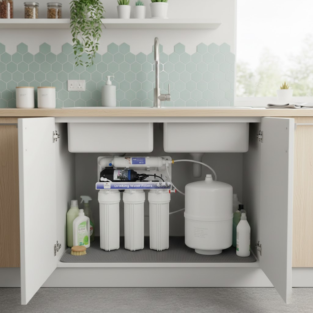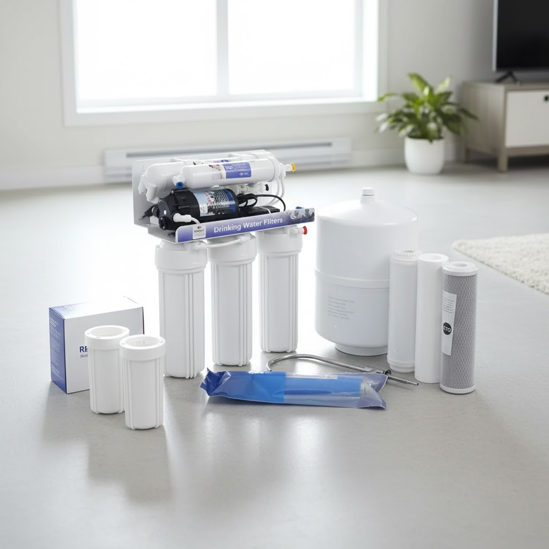 Домашняя система обратного осмоса с 5 ступенями очистки, эффективно удаляющая хлор, ржавчину, песок, посторонние запахи и вкусы. Обеспечивает глубокую фильтрацию воды до 0,0001 микрона, делая её чистой и безопасной для питья.
